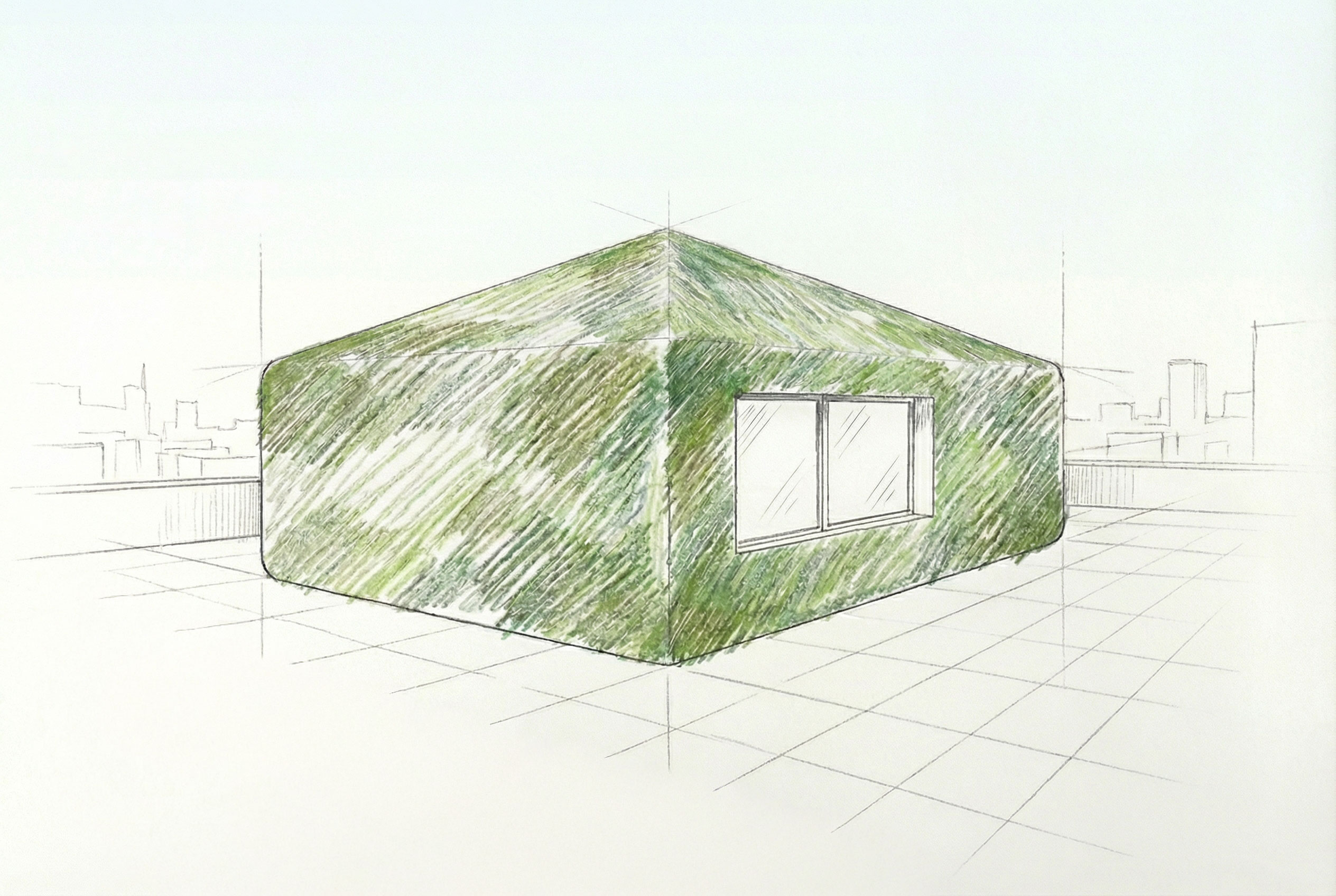 都内某所の建築物に、周囲のビル群の中でも印象に残る“緑のアイコン”を実現するため、従来のプランター植栽に加え、新たな外装緑化手法として「苔塗料」を採用いただきました。
